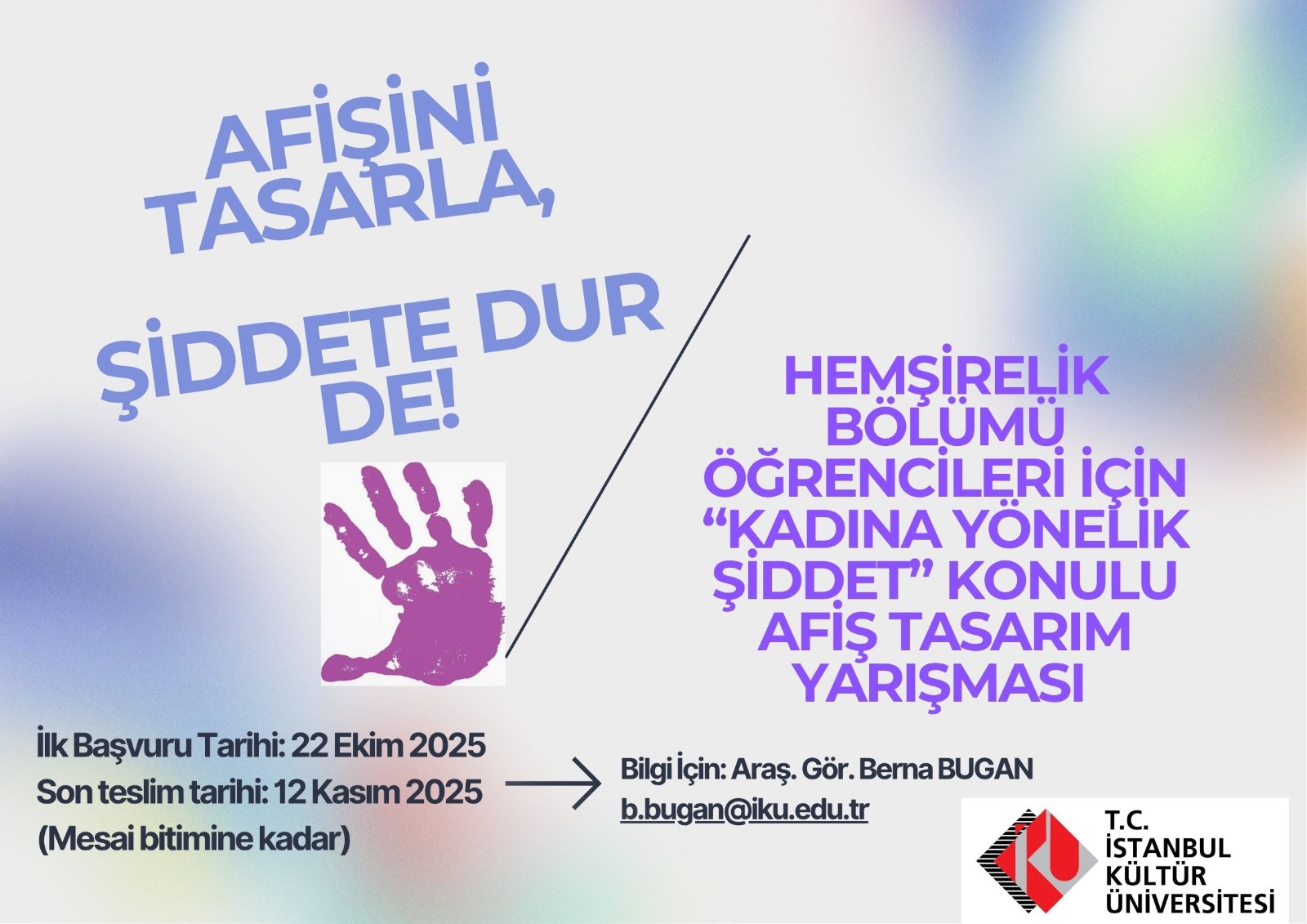 9. Afiş tasarımları iki farklı dijital dosya biçiminde (Jpeg ve PDF), imzalı formlar ile birlikte b.bugan@iku.edu.tr adresine online olarak gönderilecektir. Afişlerin basılı halleri son teslim tarihi öncesinde Arş. Gör. Berna BUGAN’a teslim edilecektir.